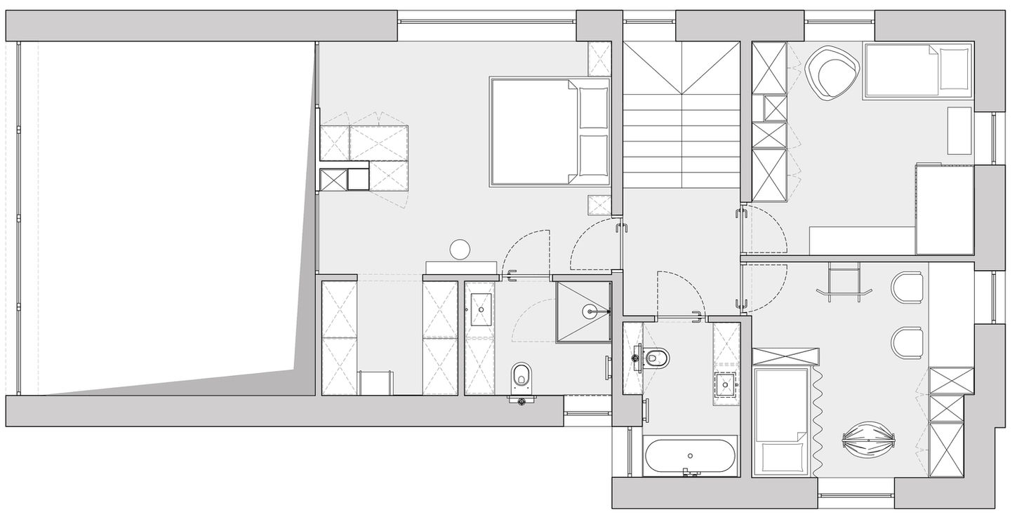 W całym domu zaprojektowałyśmy meble na wymiar, aby w 100% wykorzystać ciekawą bryłę budynku i spełnić marzenia Inwestorów o dużej ilości miejsc do przechowywania.